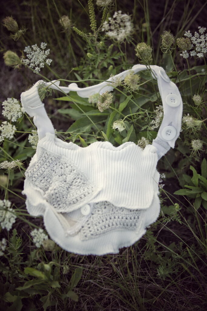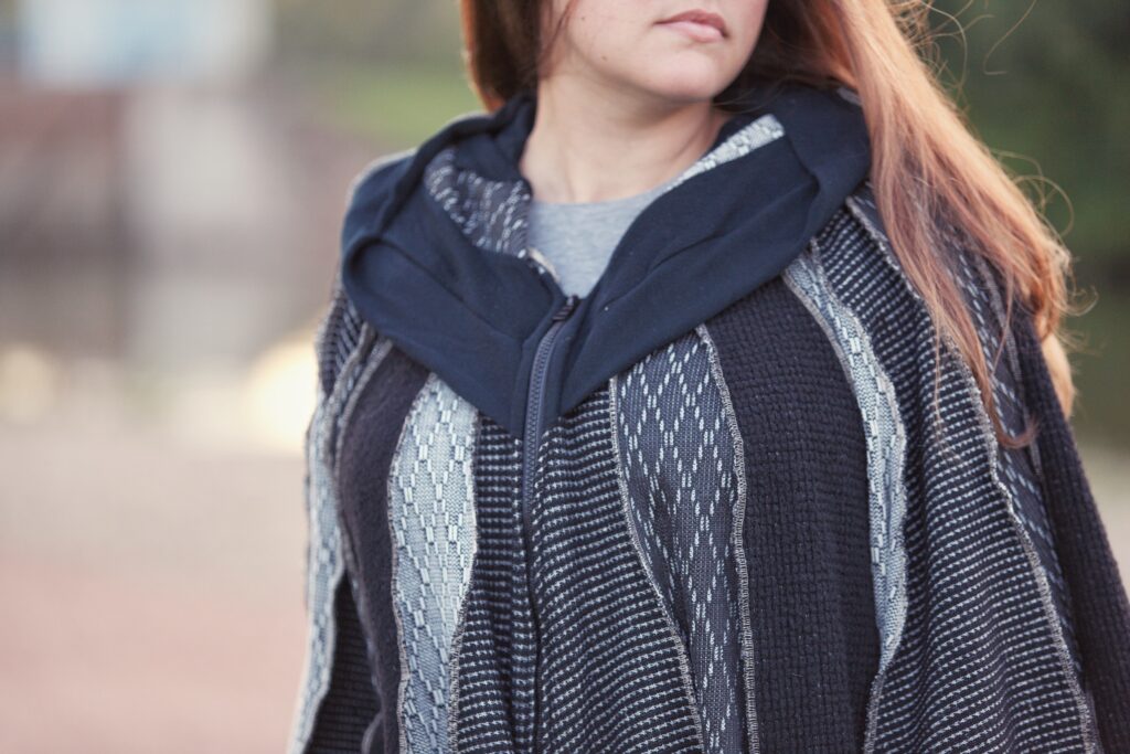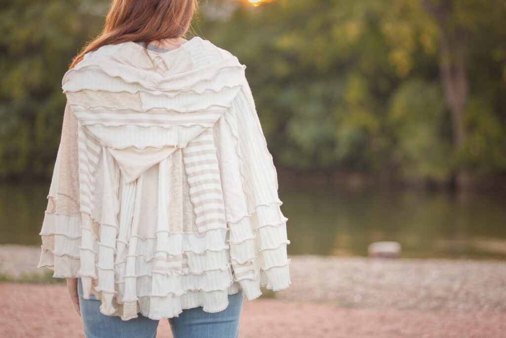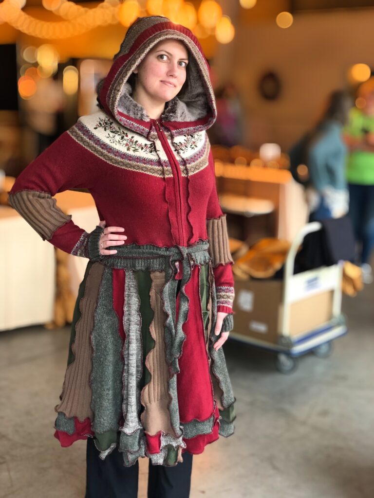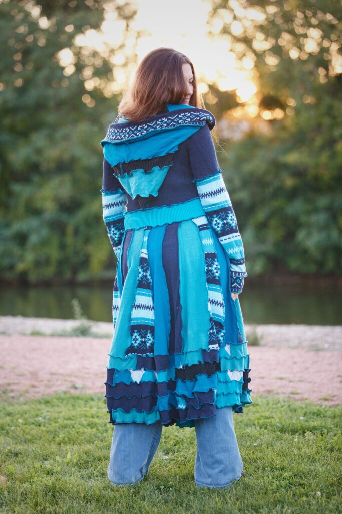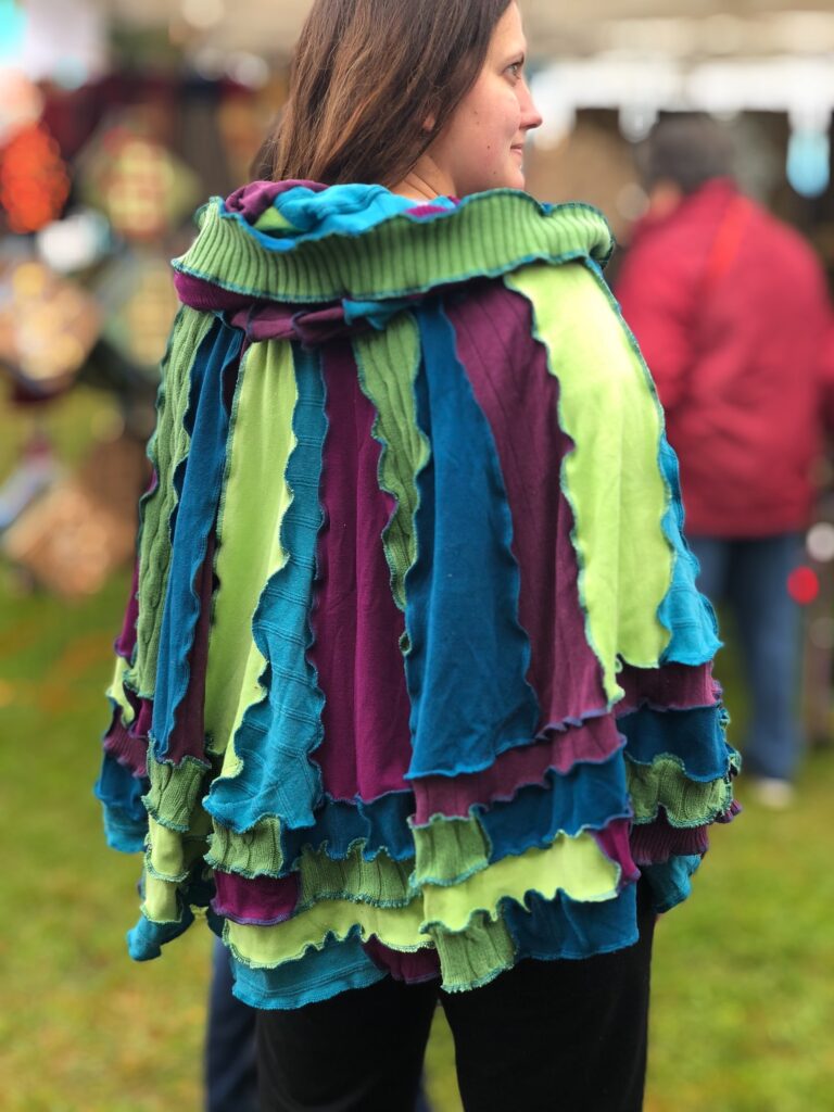 Handmade, one-of-a-kind upcycled clothing and accessories. Sweater coats, wraps, capes, hats and more — each piece beginning its life as something destined for the landfill.